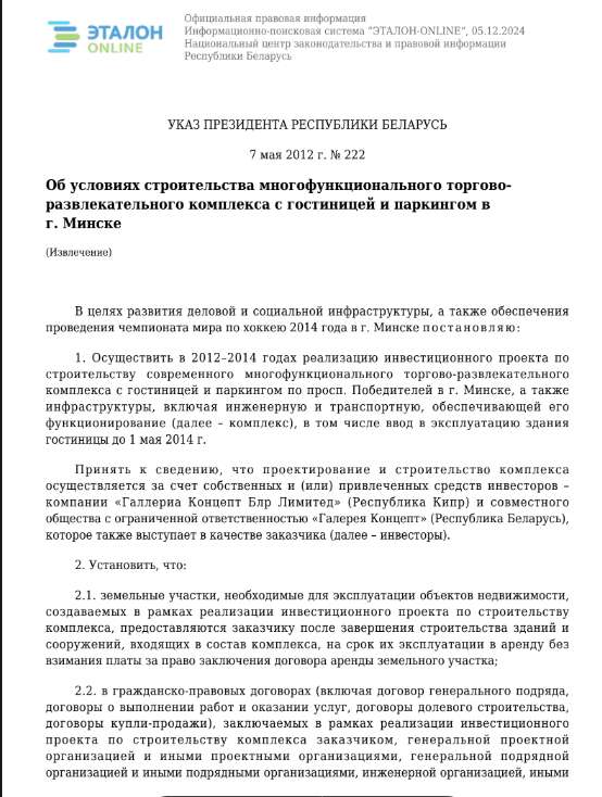 The connection of the owners of “Gallery Concept” with influential people is also indicated by the fact that during the construction of the shopping center in 2012, Alexander Lukashenko issued a decree granting the company tax and customs benefits, some of which were classified.