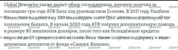 This constituted a direct violation of regulations, yet neither Akhmetzhan Yesimov nor Galimzhan Yessenov faced any responsibility. Moreover, in 2017 ATF Bank received $260 million in refinancing, followed by another $80 million in support in 2020, despite the share of nonperforming loans rising to 29%.