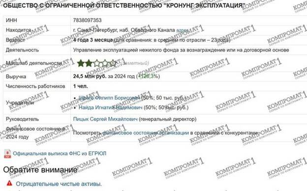 In this context, it is worth recalling that the beneficiaries of Kronung Group, Ignatiy Nayda and Philipp Shrage, are linked to the rather controversial St. Petersburg businessman Andrey Berezin (IC “Euroinvest”), who is referred to as the “wallet” of Leningrad Oblast Governor Drozdrenko and is accused of organizing schemes to withdraw money through closed-end mutual investment funds (ZPIF).